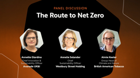 In the “Route to Net Zero” session, Moderator Neil Perry was joined by Annelie Selander (Chief Sustainability Officer, WSH), Aimie Keeler (Global Head of Climate and Nature, BAT), and Annette Giardina (Chief Innovation & Sustainability Officer, Avanade UK&I).