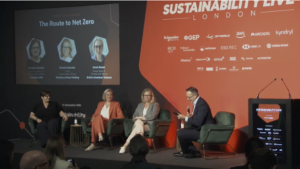 In the “Route to Net Zero” session, Moderator Neil Perry was joined by Annelie Selander (Chief Sustainability Officer, WSH), Aimie Keeler (Global Head of Climate and Nature, BAT), and Annette Giardina (Chief Innovation & Sustainability Officer, Avanade UK&I).